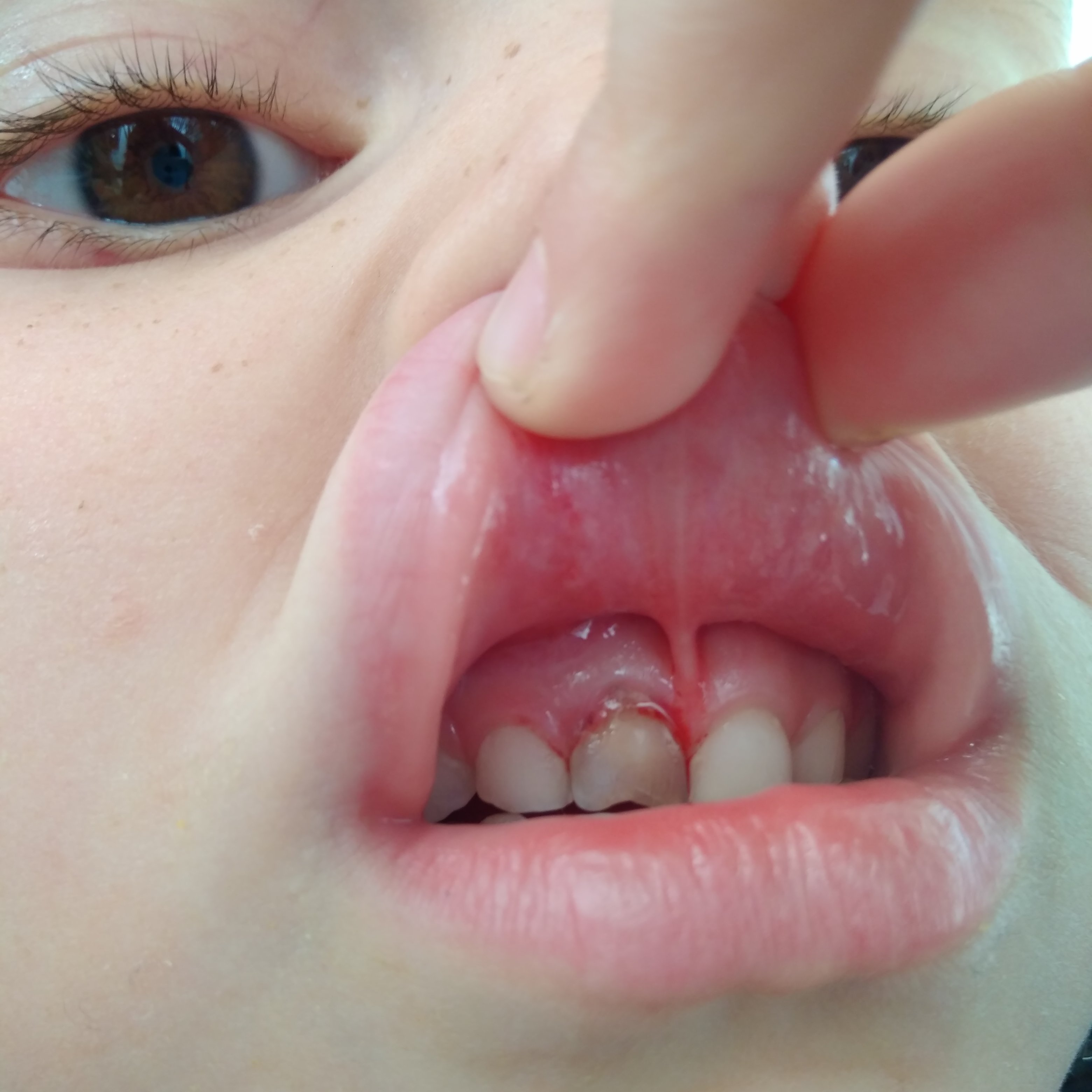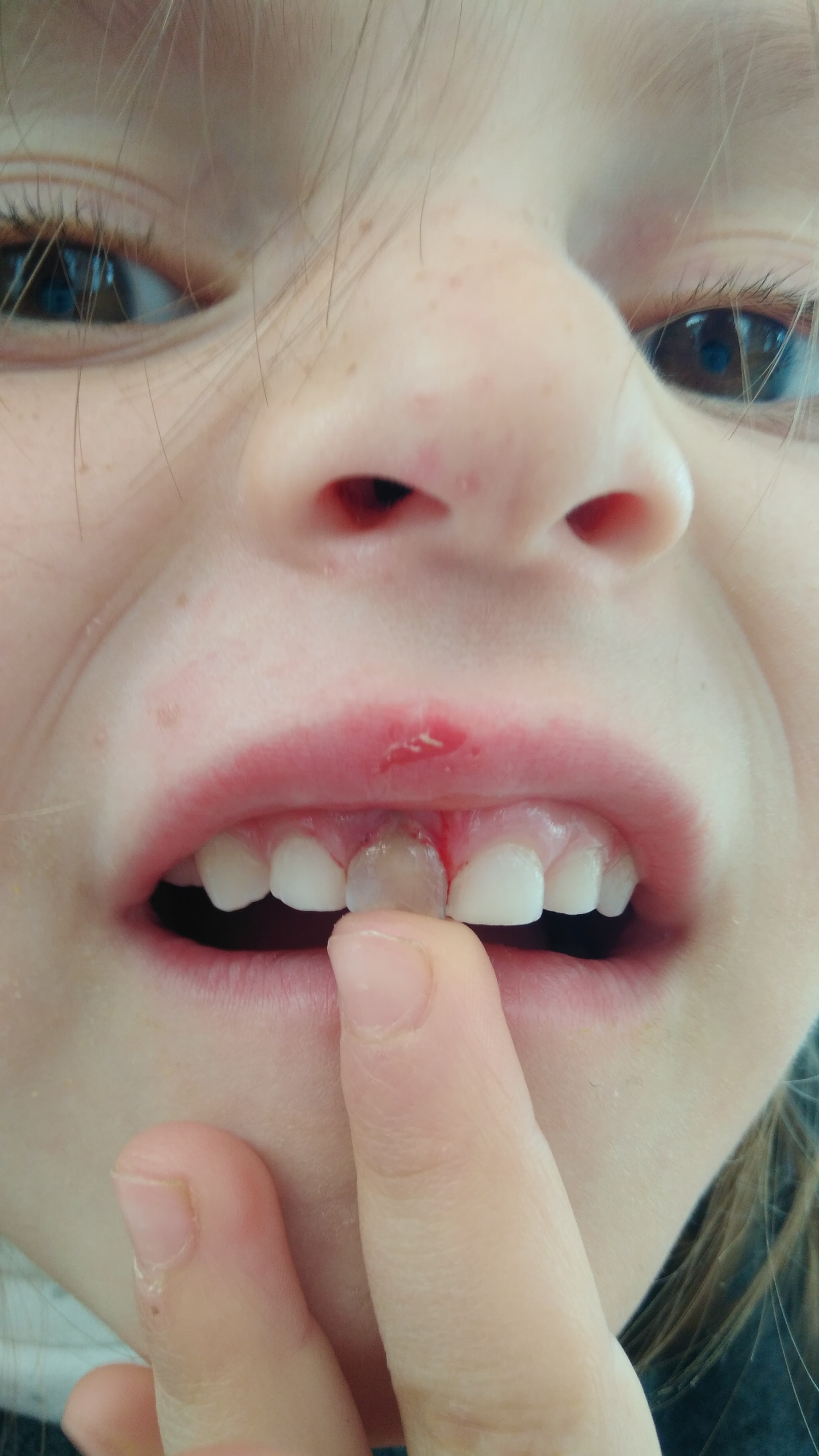 Emma s’est fait bousculée à l’école et elle est encore tombée sur sa dent. Elle bouge beaucoup. Il faudra lui arracher lors de son prochain rv en février.